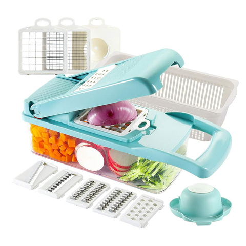 Picador de legumes azul barato 12 em 1 Cortador de legumes Cortador de alimentos com recipiente Cesta de drenagem de proteção manual